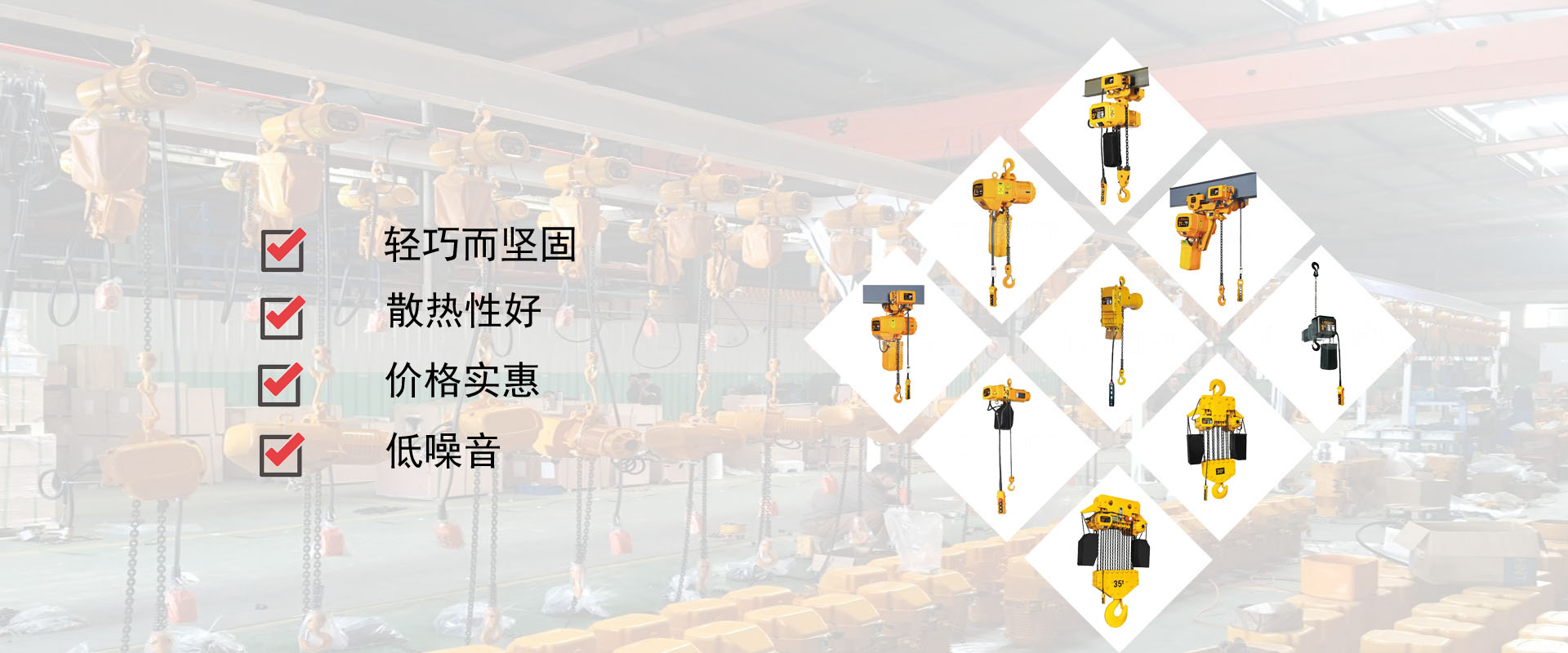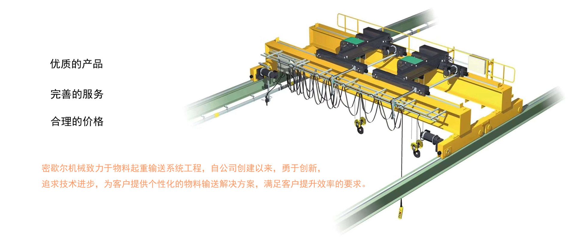 密歇爾起重機械(杭州)有限公司提供全面的起重輸送產(chǎn)品和服務(wù),產(chǎn)品覆蓋環(huán)鏈電動葫蘆(125Kg-80T),歐式鋼絲繩葫蘆,防爆葫蘆,懸臂吊,KBK柔性起重機,歐式起重機,起重馬達,端梁,起重移動供電系統(tǒng)等,在國內(nèi)外被廣泛的應用于生產(chǎn)車間,汽車,模具,機械制造,鐵路,船舶,物流搬運,現(xiàn)代化工廠流水線等工業(yè)及其它特殊用途。